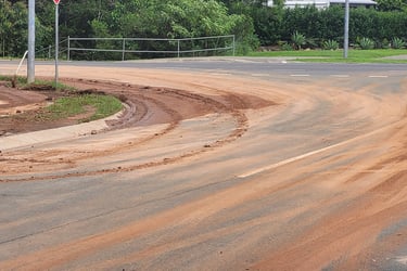 fifth time construction site stormwater pollutants and debris flowed into creek and partly blocked roads in 53 days.